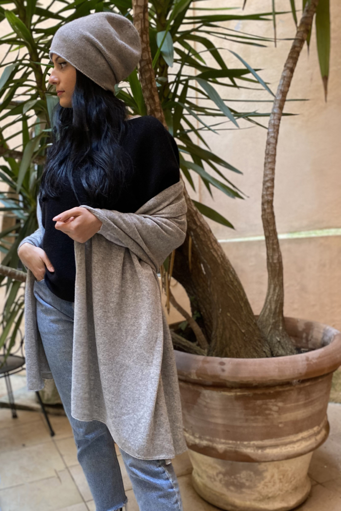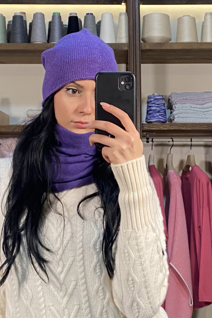 Abbinatelo ad un cappello di puro cashmere a tre fili, con finiture al vivo, morbidissimo e caldo. Una coppia perfetta per affrontare il freddo. In blu, grigio, beige, nero e altre tantissime varianti colori. Qui vi proponiamo il viola. Cosa ne dite?