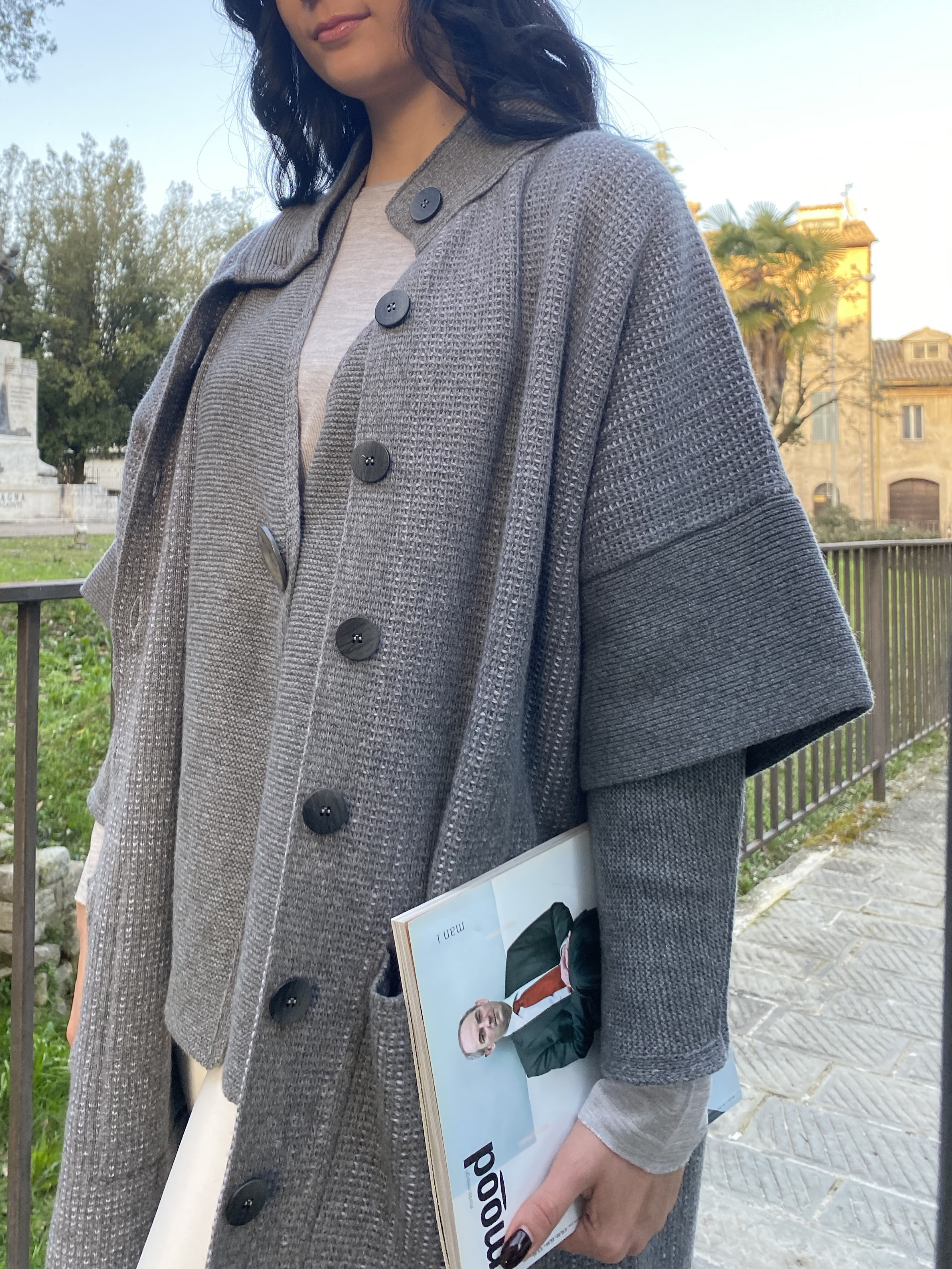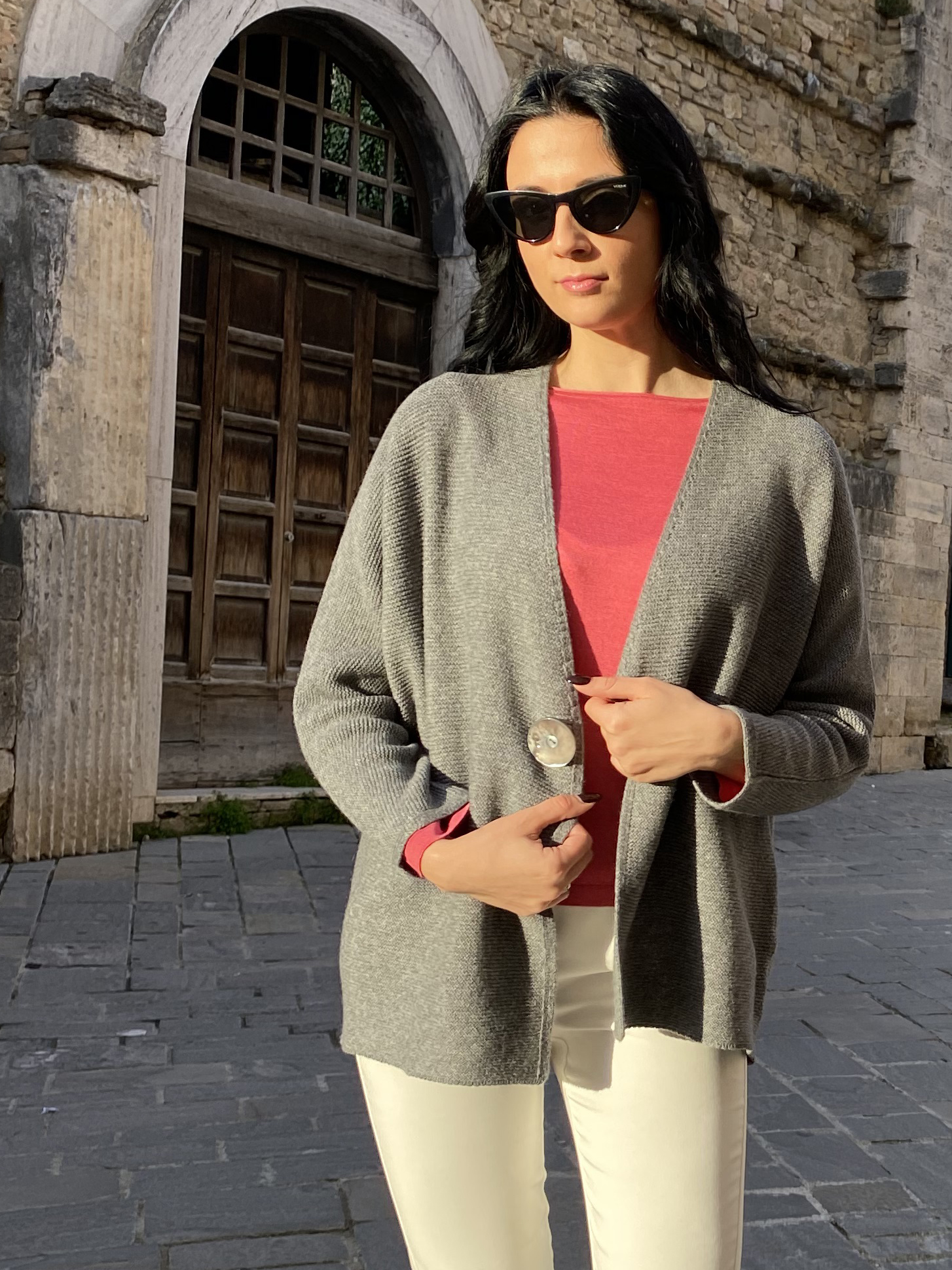 Ideale da abbinare al secondo strato, il Lorena, un morbidissimo cardigan in cashmere, seta e merinos con il bottone in madreperla: dalla vestibilitá confortevole e dalla linea over con l’arrivo della bella stagione potrà essere indossato come giacca o capospalla. Se ti piace il colore scegli di abbinaro con la versione Rosa Schiaparelli dell’articolo Irene: darà un tocco di luce e vitalità al tuo look.