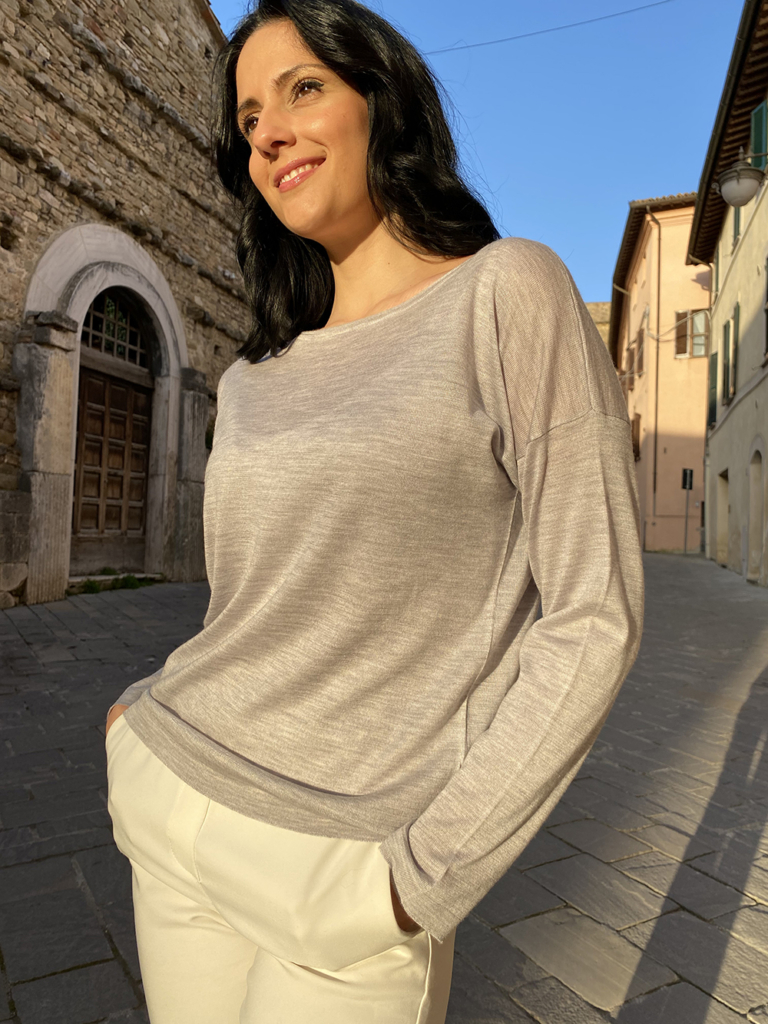 Iniziamo con un grande cult, la t-shirt in cotone organico e cashmere vergine, disponibile sia a manica corta che lunga. La sua straordinaria capacità di termoregolazione, la rende un capo 4 Seasons: fresca, soffice, confortevole, può essere indossata da sola a casa o nel tempo libero, abbinata ad un cardigan nella mezza stagione o portata con capi più pesanti in inverno.